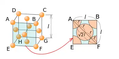 En cubique faces centrées, le paramètre de la maille se déduit facilement : (selon la diagonale d'une face du cube) avec rayon de l'atome en question, d'où : .