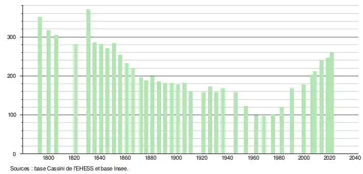 L'évolution du nombre d'habitants est connue à travers les recensements de la population effectués dans la commune depuis 1793. Pour les communes de moins de 10 000 habitants, une enquête de recensement portant sur toute la population est réalisée tous les cinq ans, les populations légales des années intermédiaires étant quant à elles estimées par interpolation ou extrapolation[31]. Pour la commune, le premier recensement exhaustif entrant dans le cadre du nouveau dispositif a été réalisé en 2008[32].