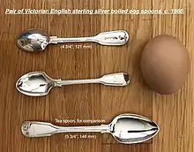Cuillères à œuf (en haut) en comparaison d'une cuillère à thé et un œuf de poule.