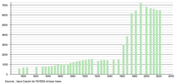 L'évolution du nombre d'habitants est connue à travers les recensements de la population effectués dans la commune depuis 1793. Pour les communes de moins de 10 000 habitants, une enquête de recensement portant sur toute la population est réalisée tous les cinq ans, les populations légales des années intermédiaires étant quant à elles estimées par interpolation ou extrapolation[32]. Pour la commune, le premier recensement exhaustif entrant dans le cadre du nouveau dispositif a été réalisé en 2006[33].
