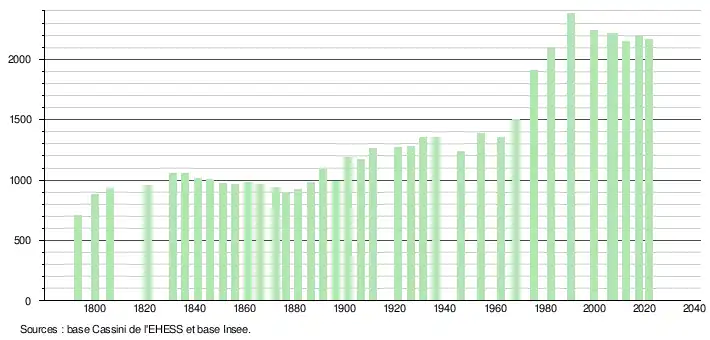 L'évolution du nombre d'habitants est connue à travers les recensements de la population effectués dans la commune depuis 1793. Pour les communes de moins de 10 000 habitants, une enquête de recensement portant sur toute la population est réalisée tous les cinq ans, les populations légales des années intermédiaires étant quant à elles estimées par interpolation ou extrapolation[31]. Pour la commune, le premier recensement exhaustif entrant dans le cadre du nouveau dispositif a été réalisé en 2007[32].