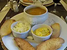 Dans cette soupe, poissons, légumes (tomates, pommes de terre) et bouillon peuvent être servis ensemble ou séparément. La soupe de poissons arlésienne s'accompagne de croûtons frottés à l'ail et nappés de sauce (rouille ou aïoli).