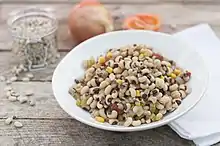 Le monde du riz aux haricots est à lui seul une encyclopédie. Hoppin'John (États-Unis) riz de Caroline, niébé ou dolique à œil noir, oignon haché et tranches de bacon qui fait penser au thiebou niebe sénégalais et red beans and rice de la Louisiane créole avec ses haricots rouges kidney bean, légumes potagers, épices et porc [99],[100],[101],[102]. Arroz con gandules (un des Arroz junto de Porto Rico) riz, pois d'Angole et porc sauce sofregit dont la forme cubaine est moro de guandule avec aromates variés. Pabellón criollo du Venezuela avec haricots noirs (frijol negro). Le gallo pinto ou gallopinto (littéralement coq coloré - Amérique centrale) est un riz-haricots aux poivrons, oignons et ail admet de nombreuses variantes sur les deux parties du continent, dont le tacu tacu péruvien riz, poivron jaune, haricots, haricots de Lima et lentilles servis avec un œuf au plat [103],[104],[105]. Rice and peas recouvre toutes ces légumineuses farineuses largement et historiquement cultivées en Amérique [106]. Une version mélange de légumineuses est l'arroz de fríjol cabecita negra avec lentilles, haricots, pois, etc. [107].