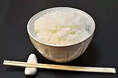 Une gastronomie d'accompagnement de ces bols de riz fumant et juste collant (Gohan) pour la baguette où la main s'est développée: choix de légumes en saumure (tsukemono), lait aigre (Syrie), bouillon clair ou sauce soja, thé vert, etc. mais rien ne complique sa fade rondeur, notamment aucune boisson alcoolisée[127],[128],[129]. Le reste de riz dans le bol à la fin du repas était tenu en Inde pour impur, il devait être jeté hors de la maison [130].