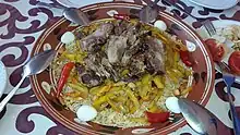 Mandi (Yémen) viandes(poulet et/ou agneau) et riz avec un mélange spécial d'épices, cuit dans une fosse creusée dans le sol qui tient lieu de four, la volaille suspendue est cuite à la vapeur du riz [89]. Le riz wolof accompagne souvent le poulet [90].