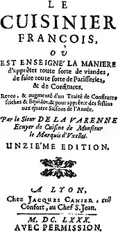 La « haute cuisine française » trouve sa source au XVIIe siècle avec le chef La Varenne. Celui-ci est considéré comme l'auteur du premier véritable livre de cuisine française, Le Cuisinier françois, en 1651[11]. Son livre comprend la plus ancienne référence à l'utilisation de graisse de porc pour réaliser le roux (préparation à base de farine pour lier les sauces). L'ouvrage comporte deux sections : l'une pour les jours avec viande et l'autre pour le jeûne. Ses recettes ont marqué un changement par rapport au style de cuisine du Moyen Âge. Il a ainsi introduit de nouvelles techniques visant à créer des plats plus légers et moins épicés (viandes rôties, poissons bouillis le plus souvent accompagnés de légumes : petits pois, asperges et artichauts sont à la mode sous Louis XIV) et une présentation plus modeste des tartes, des pâtisseries et des chaussons[note 1]. La Varenne a également publié en 1667 un livre sur la pâtisserie, intitulé Le Parfait Confiturier (réédité par la suite sous le nom de Le Confiturier françois) qui, de manière similaire, a mis à jour et codifié les nouvelles normes émergentes de la gastronomie pour les desserts et les pâtisseries[12].