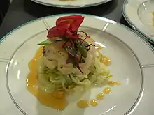 Escoffier simplifie également le menu moderne et la structure des repas. Il publie une série d'articles traitant de cet ordre qui sont finalement publiés dans son Livre des menus, en 1912. Ce type de service adopte le service dit « service à la russe » — remplaçant le « service à la française », qui était en usage depuis le Moyen Âge —, dans lequel le repas est divisé en plusieurs plats, chacun servi séparément dans son assiette. Cette façon de faire avait été rendue populaire par Félix Urbain Dubois, dans les années 1860. La contribution la plus importante d'Escoffier reste la publication du Guide culinaire[25], en 1903, qui établit les bases de la cuisine française. Il s'agit d'un ouvrage collaboratif dans lequel plusieurs chefs de haut rang illustrent l'acceptation universelle de ce nouveau style de cuisine[26].