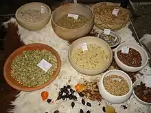- céréales (blé, épeautre, engrain, orge, seigle, avoine, millet...) pour fabriquer de la farine et semoule à la meule à grains, et cuisiner des gruau, bouillie, crêpe, galette, pain, fougasse.