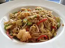 Leurs bee tai bak (米筛目 ; 米篩目) traduit en lot chhar (លតឆា) : des pâtes à la farine de riz et tapioca (manioc) en forme de queue de rat façonnées à la main ou grâce à une râpe spéciale ; sautées à la sauce de soja sucrée, poivre de Kampot, aux feuilles d'ail, pousses de haricots mungo (soja) ; servi avec un œuf au plat et de la sauce sucrée-vinaigrée sont trouvables dans tout le pays.