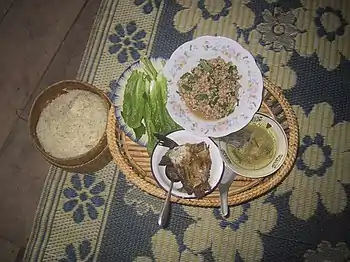 L'alimentation laotienne est à base de riz gluant (dont la population est la plus grande consommatrice au monde), agrémentée de viandes de porc, bœuf, de volailles (canard, poulet, etc.) ou de poissons d'eau douce. Les légumes sont très nombreux et variés. C'est une cuisine ordinairement très pimentée.