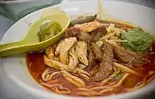 - Laksa lemak : laksa servi dans un jus riche de noix de coco, avec des crevettes, des coques, du citron vert et un morceau de sambal belacan.