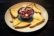 - Tapai : dessert à base de riz gluant fermenté ou de tapioca. Il peut être mangé tel quel, ou avec de la glace, du chocolat ou des fruits[36]. Ne pas confondre avec la boisson alcoolisée du même nom, faite avec les mêmes ingrédients mais pas au même stade de fermentation.