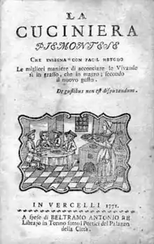 La cuisine piémontaise désigne les plats et/ou produits typiques de la région du Piémont. Cela englobe les produits frais et d'épicerie locaux, tels que les saucisses et les fromages, ainsi que les plats traditionnels régionaux.