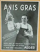 - L'anisette[10],[11] : incontournable à l'apéritif, à base d'anis vert et d'autres plantes. c'est la madeleine de Proust des pieds noirs. Les marques les plus connues sont : Anis Gras (lancée à Alger en 1872), Phénix (anisette kasher), l'anisette Cristal créée à Alger en 1884 par les frères Liminana ou le Super Anis Galiana. La mauresque est composée d'anisette et de sirop d'orgeat. Mélangée à la grenadine, elle est surnommée « la tomate » alors qu'avec de la menthe elle est appelée « le poivron » ou « le perroquet[11] ». L'anisette est accompagnée de la kémia[12] (« petite dose » en arabe), assortiment d'amuse-gueules, appelées aussi tapas selon le terme espagnol[13]. D'abord sur les comptoirs des bars, la kémia a été adoptée dans les foyers où, parfois très copieuse comme à Oran et à Alger, elle pouvait remplacer le repas. Les bliblis, pois chiches grillés (appelés aussi torraïcos)[7] ou les pépins de pastèque peuvent en faire partie, comme parfois une sfachtimi (assiette de sardines).
