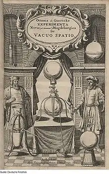 Otto de Guérique met lui aussi en évidence le phénomène de la pression atmosphérique, au moyen de l'« expérience dite des hémisphères de Magdebourg ». Une sphère métallique est composée de deux hémisphères de même diamètre, puis ils sont accolés au moyen de graisse, de cire et de térébenthine. Un vide est ensuite fait dans la sphère. La pression atmosphérique rapproche les deux parties et son action est telle que la puissance de traction de 8 chevaux ne permet pas de séparer de nouveau les hémisphères. Par contre, lorsqu'une petite ouverture laisse entrer de l'air dans la sphère, les deux parties se séparent aisément.