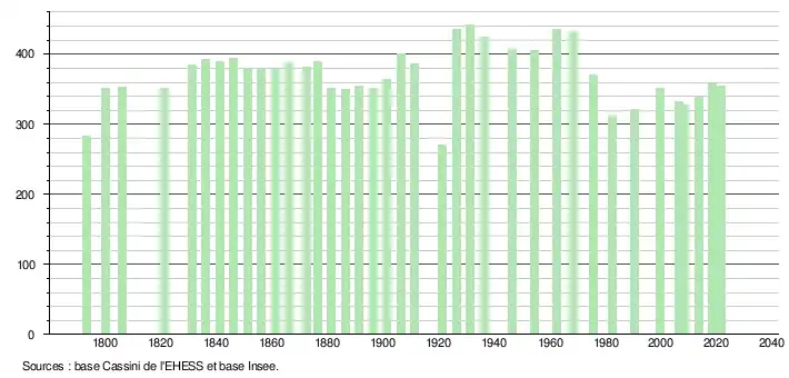 L'évolution du nombre d'habitants est connue à travers les recensements de la population effectués dans la commune depuis 1793. Pour les communes de moins de 10 000 habitants, une enquête de recensement portant sur toute la population est réalisée tous les cinq ans, les populations légales des années intermédiaires étant quant à elles estimées par interpolation ou extrapolation[23]. Pour la commune, le premier recensement exhaustif entrant dans le cadre du nouveau dispositif a été réalisé en 2008[24].
