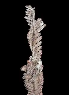| Habitus | rares cristaux distincts, cristaux de formes dérivées du cube, de l'octaèdre, du tétraèdre (dodécaèdre et tétrahexaèdre) ; habitus géminé, groupement complexe cubique, dodécaédrique ; fins agrégats filiformes, torsadés, en feuilles ou en lamelles ; masses cristallines, rare masse compacte parfois énorme, masse lamellaire, à contours irréguliers ou déchiquetés ; communément en masses dendritiques et ramuleuses dépourvues de formes régulières ou pénétrant dans les fissures de la roche encaissante; nodules, feuilles ou lames, pépites, agrégats cristallins très contorsionnés ou squelettiformes, dendritiques, arborescence, structure filiforme, masse à structure spongieuse; poudre épaisse et grossière |