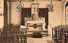 - Ameublement de la "chapelle de congrégation" de Marcq Institution (1927)[38]. La cuivrerie fournit un autel en marbre et laiton surmonté d'un "umbraculum" (voile), un tabernacle, un crucifix , une lampe de sanctuaire, des chandeliers, un tronc en laiton[38].