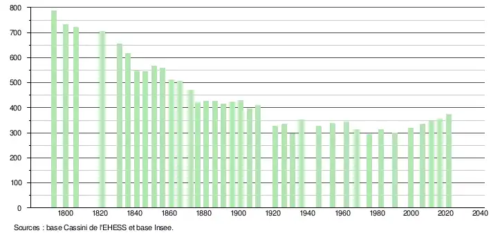 L'évolution du nombre d'habitants est connue à travers les recensements de la population effectués dans la commune depuis 1793. Pour les communes de moins de 10 000 habitants, une enquête de recensement portant sur toute la population est réalisée tous les cinq ans, les populations légales des années intermédiaires étant quant à elles estimées par interpolation ou extrapolation[19]. Pour la commune, le premier recensement exhaustif entrant dans le cadre du nouveau dispositif a été réalisé en 2006[20].