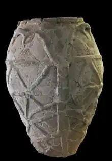 À côté des vestiges de cabanes préhistoriques circulaires, on a mis au jour une céramique décorée de lignes brunes et noirâtres, qui se croisent sur fond clair jaune-rougeâtre, également tricolore avec l'utilisation du blanc.