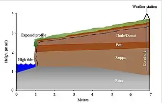 Trois ans plus tard, dans une publication de 1958, J. Meldgaard, en regard du profil stratigraphique mis en évidence sur le site archéologique de Sermermiut[Note 6], établit et définit la culture de Saqqaq[52],[9],[53],[Note 7]. Sermermiut, localisé à proximité du front glaciaire de Jakobshavn Isbræ, devient alors le premier site archéologique ayant permis d'établir l'« existence de cultures paléo-esquimaudes en contexte stratigraphique »[19],[52].