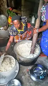 - Poulet ou poisson (nkuhu hawu nfi) et bananes vertes sauce coco, présenté bien sûr avec du riz.