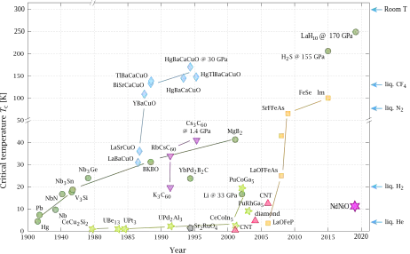 À partir de 1986, de nombreux cuprates supraconducteurs ont été identifiés et peuvent être classés en trois groupes sur un diagramme de phase température critique en fonction de la teneur en trous d'oxygène et de la teneur en trous de cuivre :