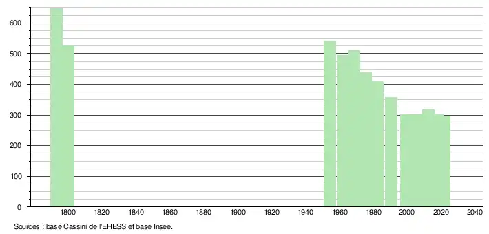 L'évolution du nombre d'habitants est connue à travers les recensements de la population effectués dans la commune depuis 1793. Pour les communes de moins de 10 000 habitants, une enquête de recensement portant sur toute la population est réalisée tous les cinq ans, les populations légales des années intermédiaires étant quant à elles estimées par interpolation ou extrapolation[50]. Pour la commune, le premier recensement exhaustif entrant dans le cadre du nouveau dispositif a été réalisé en 2007[51].