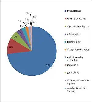 - Rhumatologie : arthrose, cervicalgie et lombalgie chroniques[13], fibromyalgie, séquelles traumatiques et postopératoires, spondylarthrite, polyarthrite.