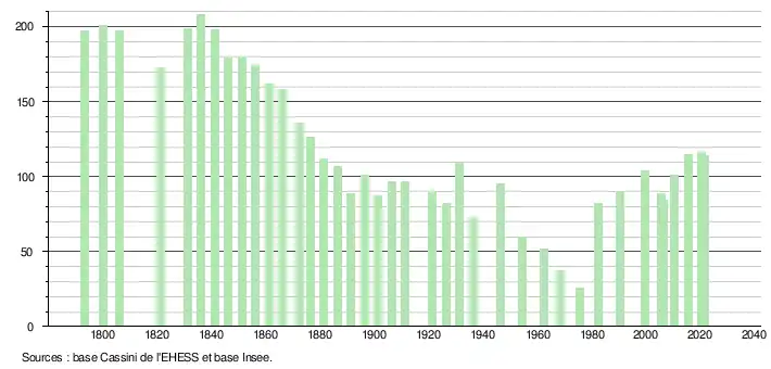 L'évolution du nombre d'habitants est connue à travers les recensements de la population effectués dans la commune depuis 1793. Pour les communes de moins de 10 000 habitants, une enquête de recensement portant sur toute la population est réalisée tous les cinq ans, les populations légales des années intermédiaires étant quant à elles estimées par interpolation ou extrapolation[14]. Pour la commune, le premier recensement exhaustif entrant dans le cadre du nouveau dispositif a été réalisé en 2005[15].