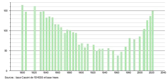 L'évolution du nombre d'habitants est connue à travers les recensements de la population effectués dans la commune depuis 1800. Pour les communes de moins de 10 000 habitants, une enquête de recensement portant sur toute la population est réalisée tous les cinq ans, les populations légales des années intermédiaires étant quant à elles estimées par interpolation ou extrapolation[13]. Pour la commune, le premier recensement exhaustif entrant dans le cadre du nouveau dispositif a été réalisé en 2007[14].