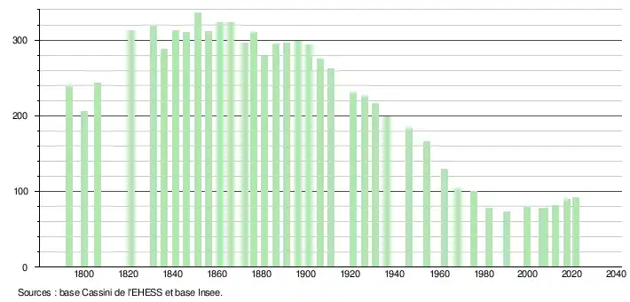 L'évolution du nombre d'habitants est connue à travers les recensements de la population effectués dans la commune depuis 1793. Pour les communes de moins de 10 000 habitants, une enquête de recensement portant sur toute la population est réalisée tous les cinq ans, les populations légales des années intermédiaires étant quant à elles estimées par interpolation ou extrapolation[17]. Pour la commune, le premier recensement exhaustif entrant dans le cadre du nouveau dispositif a été réalisé en 2007[18].