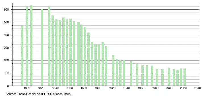 L'évolution du nombre d'habitants est connue à travers les recensements de la population effectués dans la commune depuis 1793. Pour les communes de moins de 10 000 habitants, une enquête de recensement portant sur toute la population est réalisée tous les cinq ans, les populations légales des années intermédiaires étant quant à elles estimées par interpolation ou extrapolation[14]. Pour la commune, le premier recensement exhaustif entrant dans le cadre du nouveau dispositif a été réalisé en 2006[15].