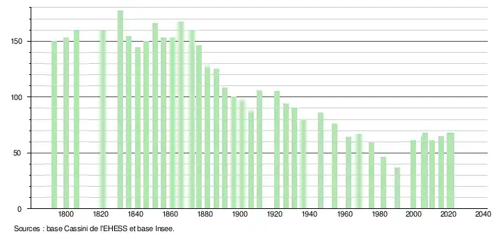 L'évolution du nombre d'habitants est connue à travers les recensements de la population effectués dans la commune depuis 1793. Pour les communes de moins de 10 000 habitants, une enquête de recensement portant sur toute la population est réalisée tous les cinq ans, les populations légales des années intermédiaires étant quant à elles estimées par interpolation ou extrapolation[19]. Pour la commune, le premier recensement exhaustif entrant dans le cadre du nouveau dispositif a été réalisé en 2005[20].