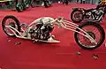 Un custom drag bike avec la roue avant soulevée, la structure arrière dite wheeliebars l'empêchant de faire une cabriole, l'accélération reposant sur la roue arrière. Aout 2019.