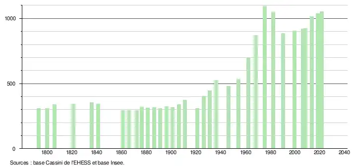 L'évolution du nombre d'habitants est connue à travers les recensements de la population effectués dans la commune depuis 1793. Pour les communes de moins de 10 000 habitants, une enquête de recensement portant sur toute la population est réalisée tous les cinq ans, les populations légales des années intermédiaires étant quant à elles estimées par interpolation ou extrapolation[20]. Pour la commune, le premier recensement exhaustif entrant dans le cadre du nouveau dispositif a été réalisé en 2008[21].