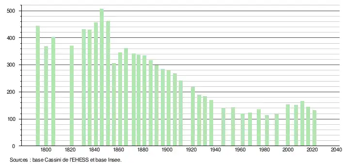 L'évolution du nombre d'habitants est connue à travers les recensements de la population effectués dans la commune depuis 1793. Pour les communes de moins de 10 000 habitants, une enquête de recensement portant sur toute la population est réalisée tous les cinq ans, les populations légales des années intermédiaires étant quant à elles estimées par interpolation ou extrapolation[21]. Pour la commune, le premier recensement exhaustif entrant dans le cadre du nouveau dispositif a été réalisé en 2006[22].