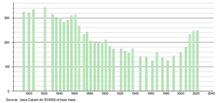 L'évolution du nombre d'habitants est connue à travers les recensements de la population effectués dans la commune depuis 1793. Pour les communes de moins de 10 000 habitants, une enquête de recensement portant sur toute la population est réalisée tous les cinq ans, les populations légales des années intermédiaires étant quant à elles estimées par interpolation ou extrapolation[21]. Pour la commune, le premier recensement exhaustif entrant dans le cadre du nouveau dispositif a été réalisé en 2006[22].