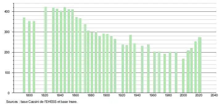L'évolution du nombre d'habitants est connue à travers les recensements de la population effectués dans la commune depuis 1793. Pour les communes de moins de 10 000 habitants, une enquête de recensement portant sur toute la population est réalisée tous les cinq ans, les populations légales des années intermédiaires étant quant à elles estimées par interpolation ou extrapolation[16]. Pour la commune, le premier recensement exhaustif entrant dans le cadre du nouveau dispositif a été réalisé en 2005[17].