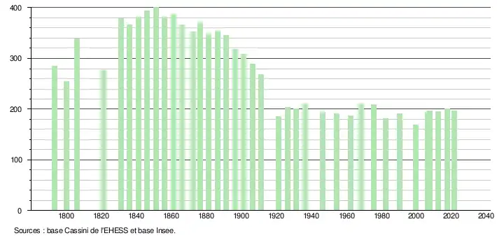L'évolution du nombre d'habitants est connue à travers les recensements de la population effectués dans la commune depuis 1793. Pour les communes de moins de 10 000 habitants, une enquête de recensement portant sur toute la population est réalisée tous les cinq ans, les populations légales des années intermédiaires étant quant à elles estimées par interpolation ou extrapolation[22]. Pour la commune, le premier recensement exhaustif entrant dans le cadre du nouveau dispositif a été réalisé en 2007[23].
