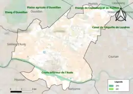L’inventaire des zones naturelles d'intérêt écologique, faunistique et floristique (ZNIEFF) a pour objectif de réaliser une couverture des zones les plus intéressantes sur le plan écologique, essentiellement dans la perspective d’améliorer la connaissance du patrimoine naturel national et de fournir aux différents décideurs un outil d’aide à la prise en compte de l’environnement dans l’aménagement du territoire. Deux ZNIEFF de type 1[Note 2] sont recensées sur la commune[18] : le cours inférieur de l'Aude (295 ha), couvrant 12 communes du département[19], et les étangs de Capestang et de Poilhes (759 ha), couvrant 6 communes dont 2 dans l'Aude et 4 dans l'Hérault[20] et une ZNIEFF de type 2[Note 3],[18] : la basse plaine de l'Aude et étang de Capestang (7 120 ha), couvrant 10 communes dont 4 dans l'Aude et 6 dans l'Hérault[21].