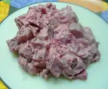 Pendant le Cwarmê, la salade russe de Malmedy régale les participants. C'est une salade froide composée notamment de harengs marinés, de betterave rouge, de noix, de pommes de terre, etc.