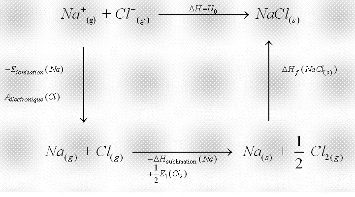 - Nous avons encore l'énergie de formation, qui représente l'énergie reçue ou absorbée lors de la formation du chlorure de sodium à partir des éléments à l'état natif (soit le sodium métallique, et le dichlore gazeux) :