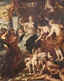 Dans cette œuvre, Marie de Médicis est représentée de façon allégorique comme la personnification de la Justice. Elle est entourée d'un cortège de personnages ou dieux du panthéon grec et romain, tels que Cupidon, Minerve, la Prudence, l'Abondance, Saturne et deux incarnations de Fama. Tous sont représentés avec leurs attributs traditionnels : Cupidon avec sa flèche, Prudence porte un serpent enroulé autour de son bras en signe de sagesse, Abondance porte sa corne d'abondance, Minerve porte son casque et son bouclier, Saturne possède sa faucille et les Fama portent une trompette pour annoncer l'événement[64]. Ces personnifications sont accompagnés à leur tour par plusieurs figures allégoriques sous couvert de quatre putti et trois créatures maléfiques (l'envie, l'ignorance et le vice) ainsi que d'un certain nombre d'autres symboles habituellement employés par Rubens dans tous les tableaux du Cycle[65].