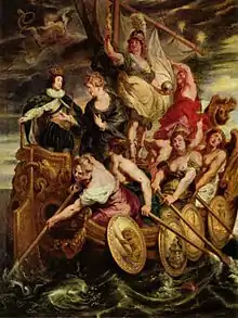 Dans l'œuvre de Rubens, le navire représente l'État avec Louis XIII à sa tête et mis en mouvement par des rameurs qui peuvent être identifiés chacun par le bouclier emblématique qui pend sur le côté du navire : de gauche à droite, la Force, la Religion, la Concorde et la Justice[71]. Le bateau est orné d'un dragon à l'avant et de dauphins sur la poupe. Louis regarde sa mère, qui s'incline légèrement vers son souverain, pour obtenir ses conseils sur la façon de diriger le navire de l'État. Dans les nuages tumultueux se trouvent deux Renommées, l'une avec un buccin romain et l'autre avec ce qui semble être une trompette. Le personnage qui ajuste la voile semble être la Prudence ou la Tempérance. Au centre, devant le mât, un personnage incarne la France, avec une flamme dans sa main droite, symbole de la fermeté, et l'orbe du gouvernement dans sa main gauche, représentant le globe du pouvoir.