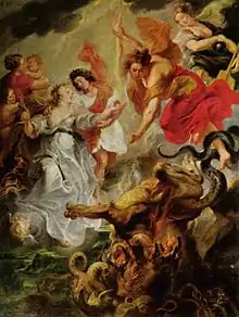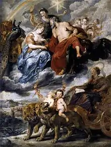 Sur la gauche, Jupiter et Saturne accueillent le roi de France qui a été assassiné le lendemain du couronnement officiel de la reine à Saint-Denis. Il est représenté comme un empereur romain divinisé s'élevant vers le mont Olympe[49], tandis qu'un serpent symbolisant son assassin agonise au sol[50]. Comme dans toutes les peintures allégoriques de Rubens, le choix de ces deux personnages a un sens symbolique. Jupiter est l'équivalent céleste du roi, tandis que Saturne, qui représente le temps fini, représente la fin de l'existence mortelle de Henri IV[51]. Il est accueilli au ciel par Mercure et Hercule, dont l'image avait été récupérée par les Bourbons[50].