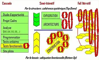 Dans le cycle semi-itératif les deux premières phases classiques (top down, par le besoin) consistent en l’expression des besoins et la conception de la solution. C’est lors de la troisième et dernière grande phase, la construction du produit (bottom up, par la structure) que la notion d’itérations courtes intervient[6]. C'est vers 2001 avec l'apparition de plusieurs méthodes dont ASD, FDD, Crystal, Scrum[7] ou l'extreme programming[8] et la vision uniformisée de leurs auteurs dans le cadre du Manifeste Agile (Agile Manifesto) et de l'Agile Alliance, que le cycle semi-itératif fut généralisé. Toutes les méthodes Agiles débutent par des phases séquentielles, courtes mais bien réelles, d'exploration, d'architecture et de planning. Un usage totalement itératif de ces méthodes n'est cependant pas exclu mais ne peut s'appliquer qu'à de très petits projets[réf. nécessaire].