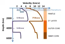 Bien que la présence de carbone dans le noyau de la Terre soit bien limitée, des études récentes suggèrent que de grandes quantités de carbone pourraient être stockés dans ce dernier. Les ondes de cisaillement (S) se déplaçant à travers le noyau interne se déplacent à environ cinquante pour cent de la vitesse attendue pour la plupart des alliages riches en fer[20]. Étant donné que la composition du noyau est largement considérée comme un alliage de fer cristallin avec une petite quantité de nickel, cette anomalie sismographique indique l'existence d'une autre substance dans la région. Une théorie postule qu'un tel phénomène est le résultat de divers éléments légers, y compris du carbone, dans le noyau. En fait, des études ont utilisé des cellules à enclumes en diamant pour reproduire les conditions du noyau terrestre, dont les résultats indiquent que le carbure de fer Fe7C3 correspond aux vitesses de son et de densité du noyau interne compte tenu de son profil de température et de pression. Par conséquent, le modèle de carbure de fer pourrait servir de preuve que le noyau contient jusqu'à 67 % du carbone de la Terre[21]. En outre, une autre étude a révélé que le carbone se dissolvait dans le fer et formait une phase stable avec la même composition en Fe7C3, bien qu'avec une structure différente de celle mentionnée précédemment[22]. Par conséquent, bien que la quantité de carbone potentiellement stockée dans le noyau terrestre ne soit pas connue, des recherches récentes indiquent que la présence de carbures de fer pourrait être cohérente avec les observations géophysiques.
