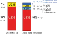 Au bout de trois ans d'irradiation, le combustible s'est transformé avec l'apparition de plutonium, de produits de fission et d'actinides mineurs. La composition du combustible irradié extrait du cœur d’un réacteur dépend de la quantité initiale de matière fissile et de l’énergie qui en a été extraite.