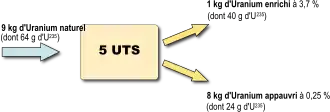 Pour produire 1 kg d'uranium enrichi, 9 kg d'uranium naturel sont nécessaires et 8 kg d'uranium appauvri sont produits sous forme d’hexafluorure. Pour faciliter son entreposage, celui-ci doit faire l’objet d’une défluoration, à l'issue de laquelle il est transformé en octaoxyde de triuranium stable dit « U3O8 appauvri ». Cette opération est effectuée à l'usine W d’Areva NC sur le site du Tricastin[D 1].